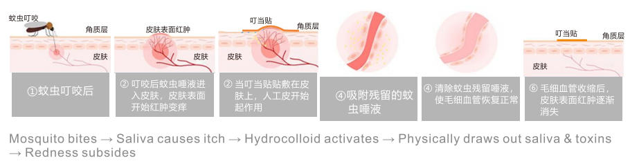运用先进的胶体吸附技术,将蚊虫叮咬后残留于皮内含毒素的唾液吸附出来,达到止痒消包;采用天然植物精油,采用先进微囊包裹缓释技术,提高驱蚊时效,并具有抗菌消炎的作用;直接贴于皮肤,隔离蚊虫叮咬后创口,避免挠痒引起的破溃感染。